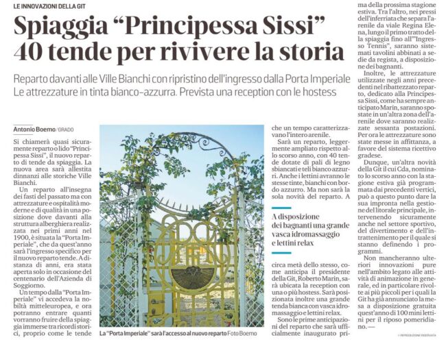 Die Nachricht ist in den italianischen Zeitungen angekommen: der Strand von Prinzessin Sissi öffnet seine Imperiale Tür vor der Hotel Ville Bianchi in Grado.