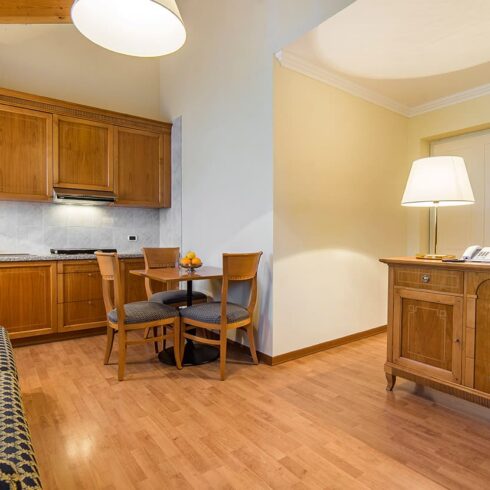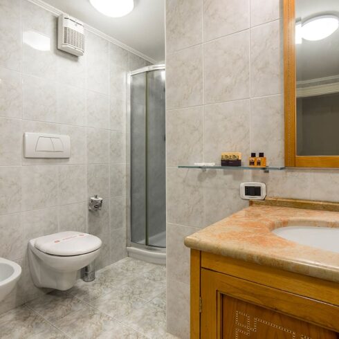Ein Badezimmer verfügt über Dusche, Toilette, Bidet und Haartrockner, das andere ist ein Service-Badezimmer.